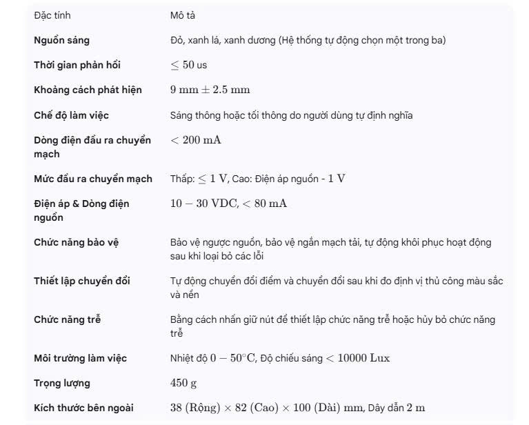 Cảm biến này sử dụng bộ vi xử lý đơn chip làm thành phần điều khiển chính. Kết hợp công nghệ quang học và quang điện tử bán dẫn, cảm biến sữ dụng thuật toán chọn màu nguồn sáng và thuật toán cài đặt độ nhạy, giúp đơn giản hóa ứng dụng cảm biến và mang lại sự tiện lợi cho người dùng. Săn phẩm này được sử dụng làm cảm biến kết hợp với các thiết bị điện hoặc mạch khác trong hệ thống điều khiển tự động của máy móc đóng gói, in ấn, dệt may và sản xuất giấy. Cảm biến phát hiện sự hiện diện của dẫu màu hoặc các mẫu dấu khác, khối màu, sọc hoặc vật thể, mẫu dấu khác, khối màu, sọc hoặc vật thể,