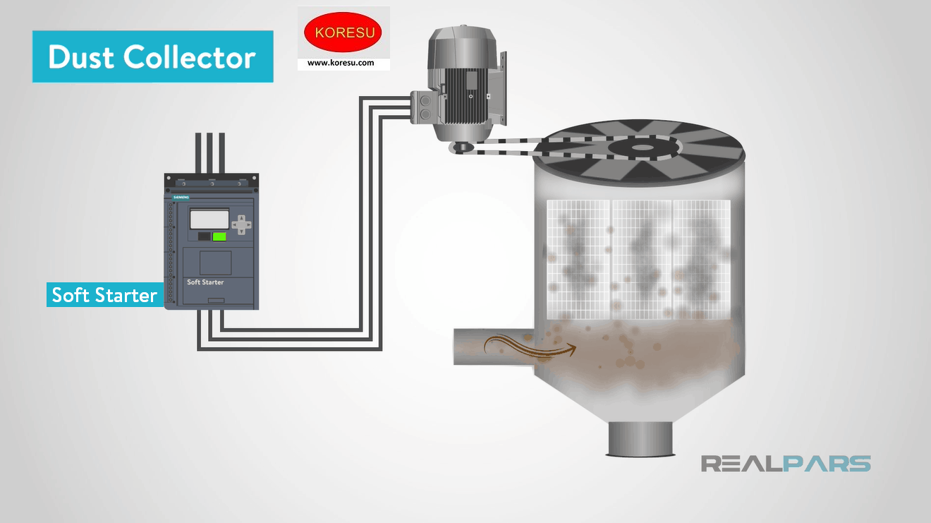 Như phần trên mình có nói, Soft starter dùng cho các hệ thống mà có tải quán tính cao, đòi hỏi dòng khởi động lớn. Vì vậy, ở trường hợp này, hệ thống làm mát/hút bụi bằng không khí sẽ cần dòng khởi động khá lớn để có thể quay các quạt bên trong. Khi quạt đã quay ổn định, lúc này dòng điện hoạt động sẽ giảm xuống mức thấp.