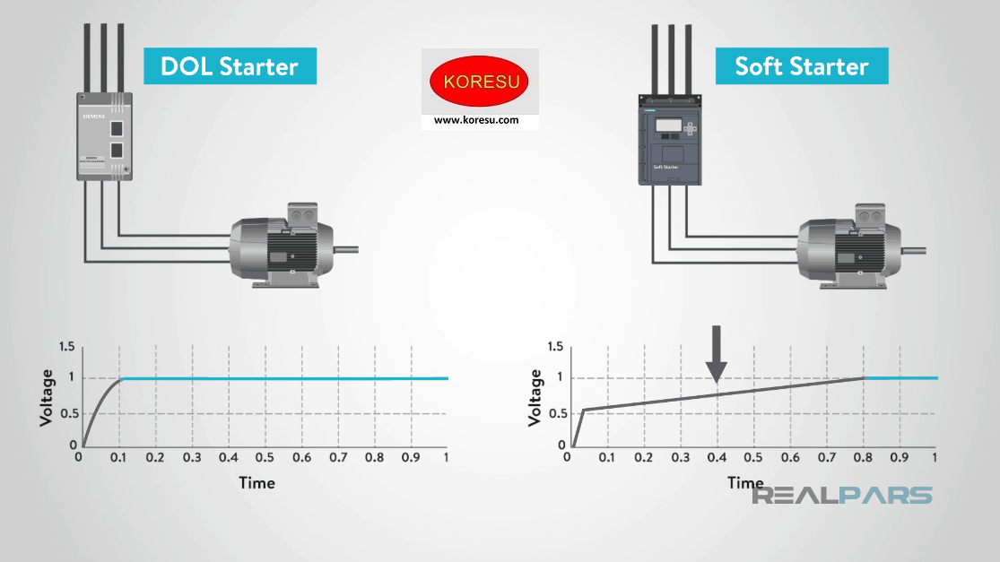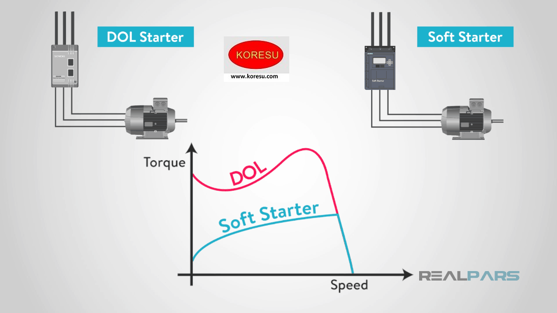 Với bộ Soft starter, động cơ sẽ tăng tốc chậm hơn và được kiểm soát nhiều hơn. Trong khi với phương pháp DOL làm cho động cơ tăng tốc gần như ngay lập tức.