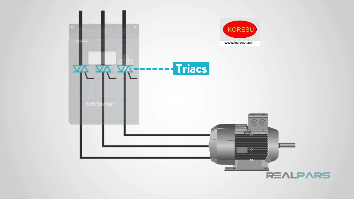 Thành phần chính của bộ khởi động mềm – Soft starter chính là Triac. Chúng được dùng để giới hạn điện áp đặt vào động cơ. Một con Triac sẽ bao gồm hai thyristor hoặc SCR lắp ngược nhau. Khi xung nội bên trong được kích thì nó sẽ mở cổng cho phép dòng điện chạy qua và sau đó đẩy dòng điện tới động cơ của chúng ta.