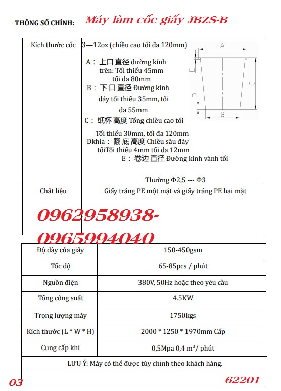 Dưới đây là báo giá chi tiết và các thông số mô hình máy làm cốc giấy tự động: