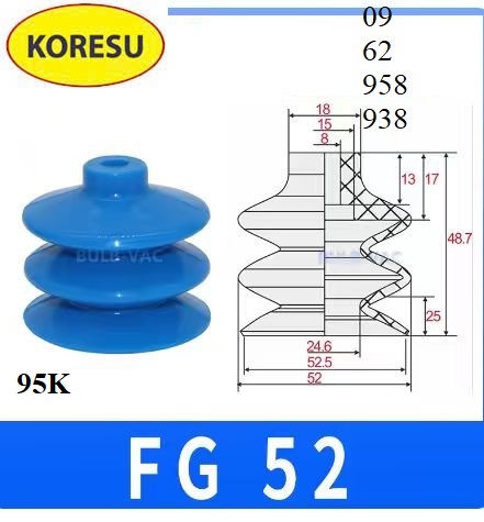Núm hút FG42, FG52 hoạt động dựa trên nguyên lý tạo áp suất âm để hút và giữ chặt vật liệu một cách an toàn, không gây trầy xước. Chúng được thiết kế với cấu trúc bellows (3-4 gấp nếp), cho phép cup co giãn linh hoạt lên đến 2-5mm, phù hợp với bề mặt đa dạng từ phẳng đến hơi cong.