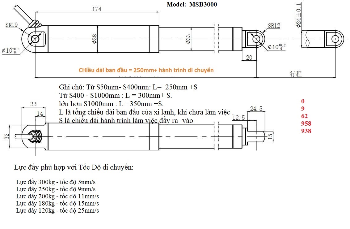 Model: MSB3000: Kích thươc áp dụng cho hành trình đẩy 400mm, 500mm, đến 1000mm,