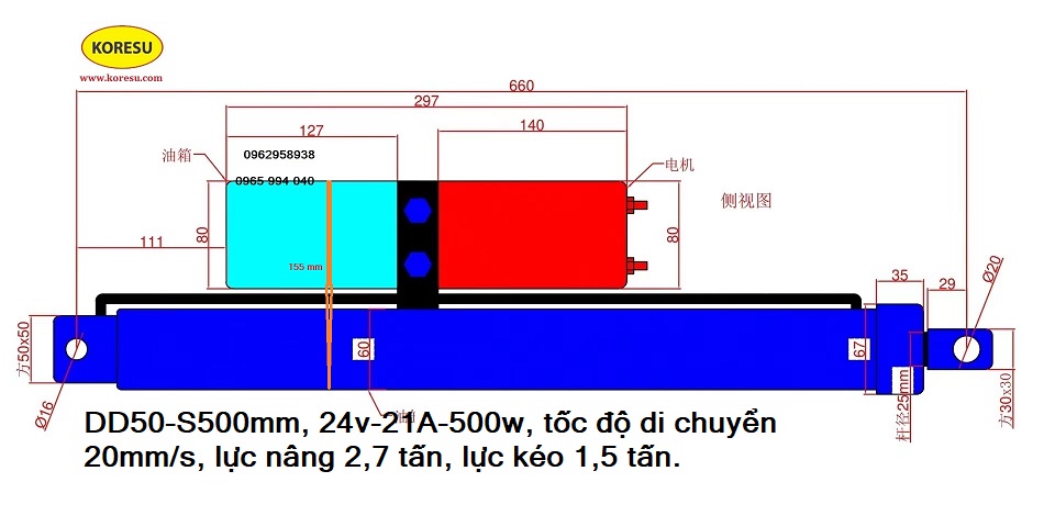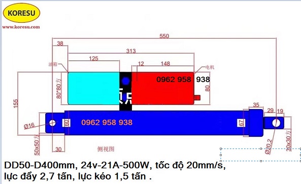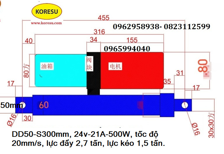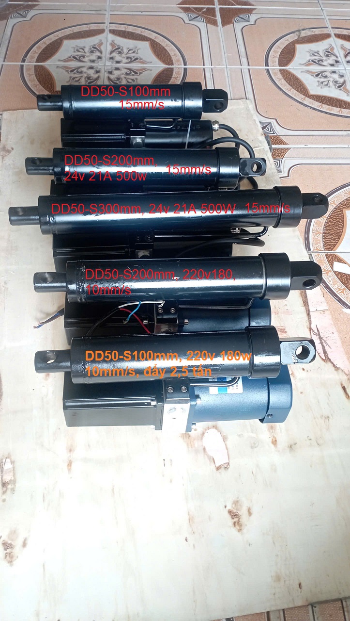 DD50 , điện DC24v, 21A, 500w, tốc độ di chuyển của trục đẩy 20mm/s .