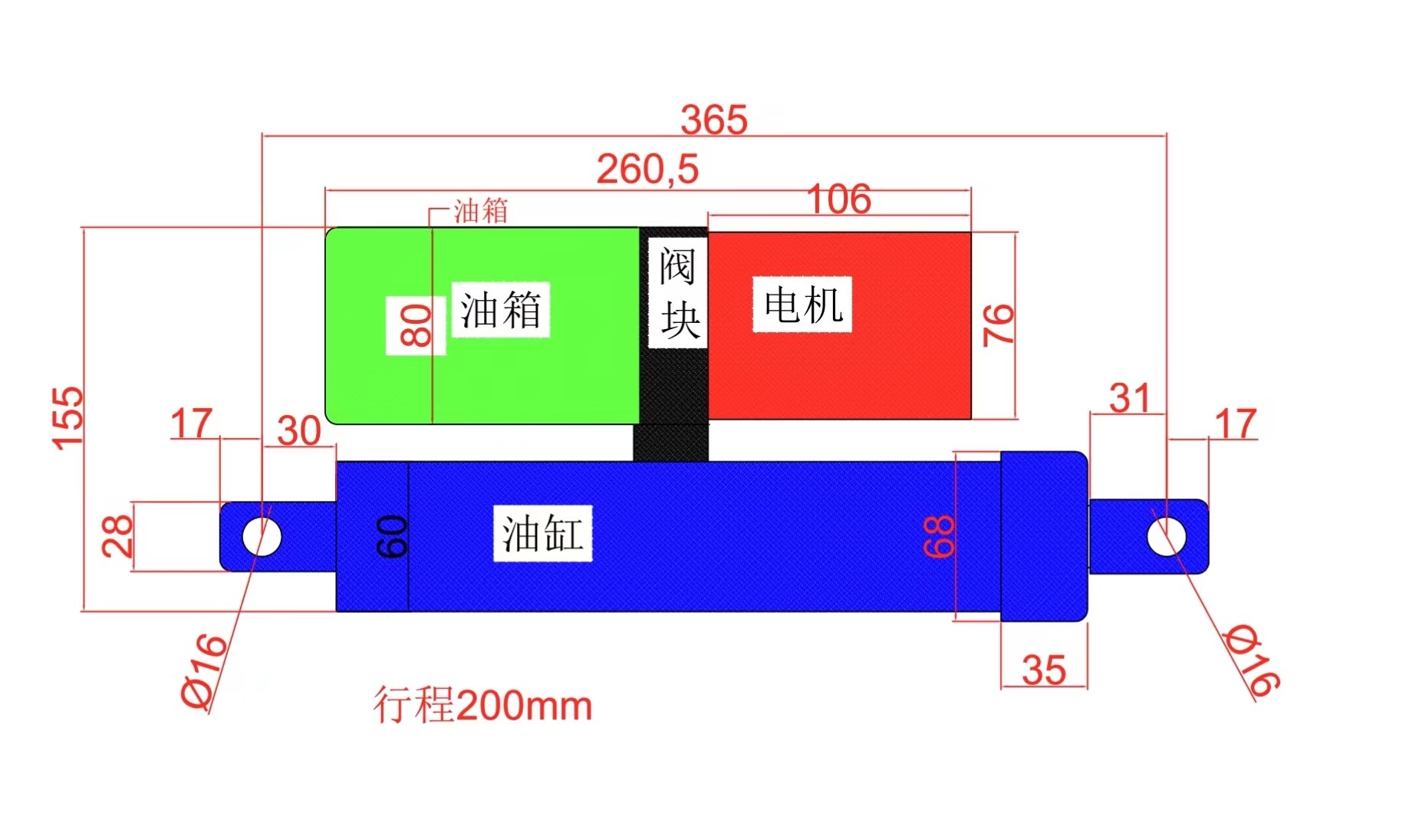 Tổng chiều dài khi làm việc = Chiều dài cây xi lanh điện thuỷ lực khi chưa làm việc + Hành trình di chuyển.